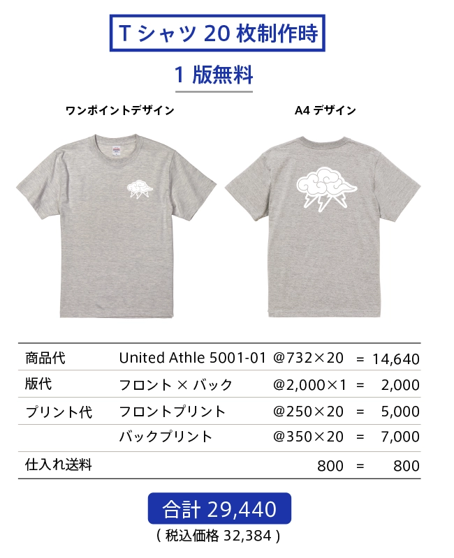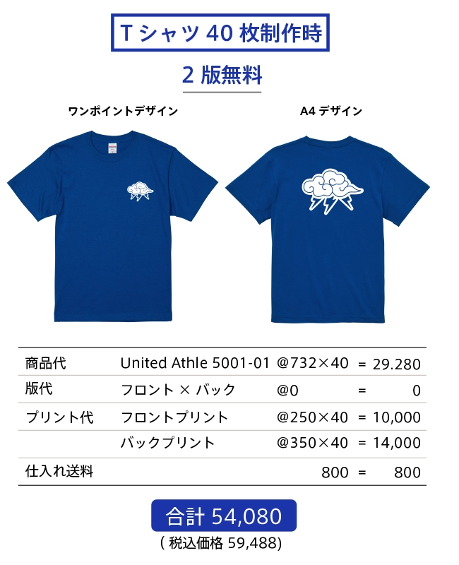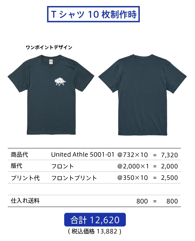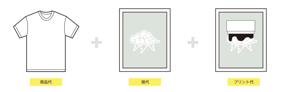 制作料金は商品代金(仕入れ送料含む)+製版代+プリント代となります。